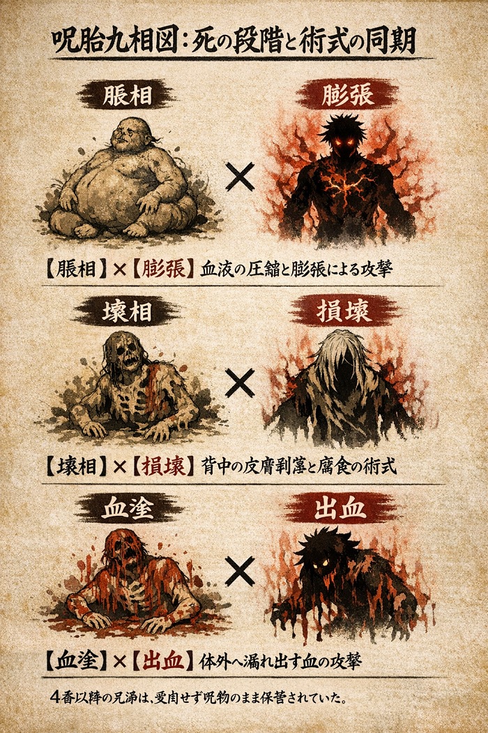 呪胎九相図の1番から3番、すなわち脹相、壊相(えそう)、血塗(けちず)のデザインと術式は、九相図の最初の3段階と驚くほど緻密に同期しています。